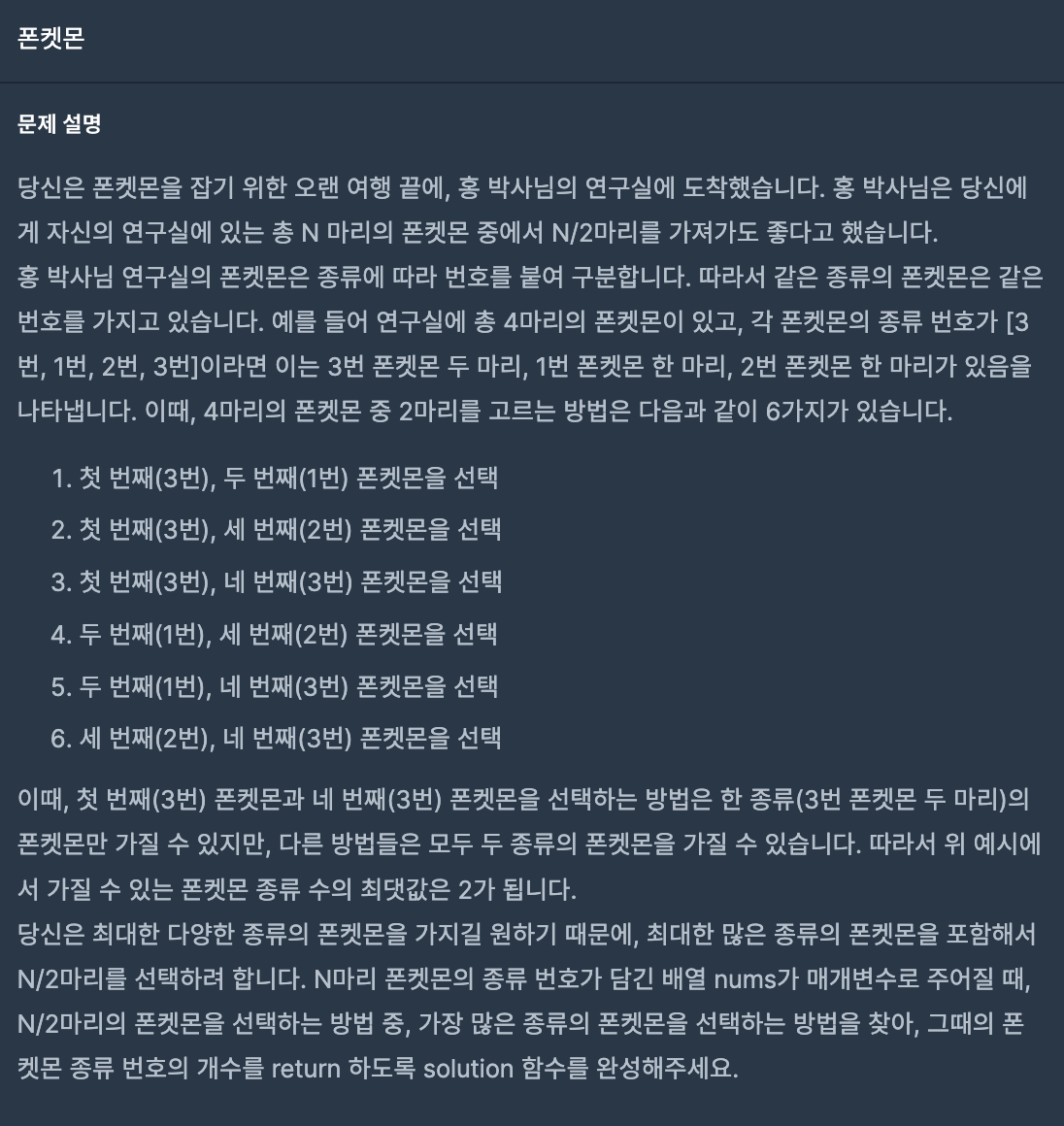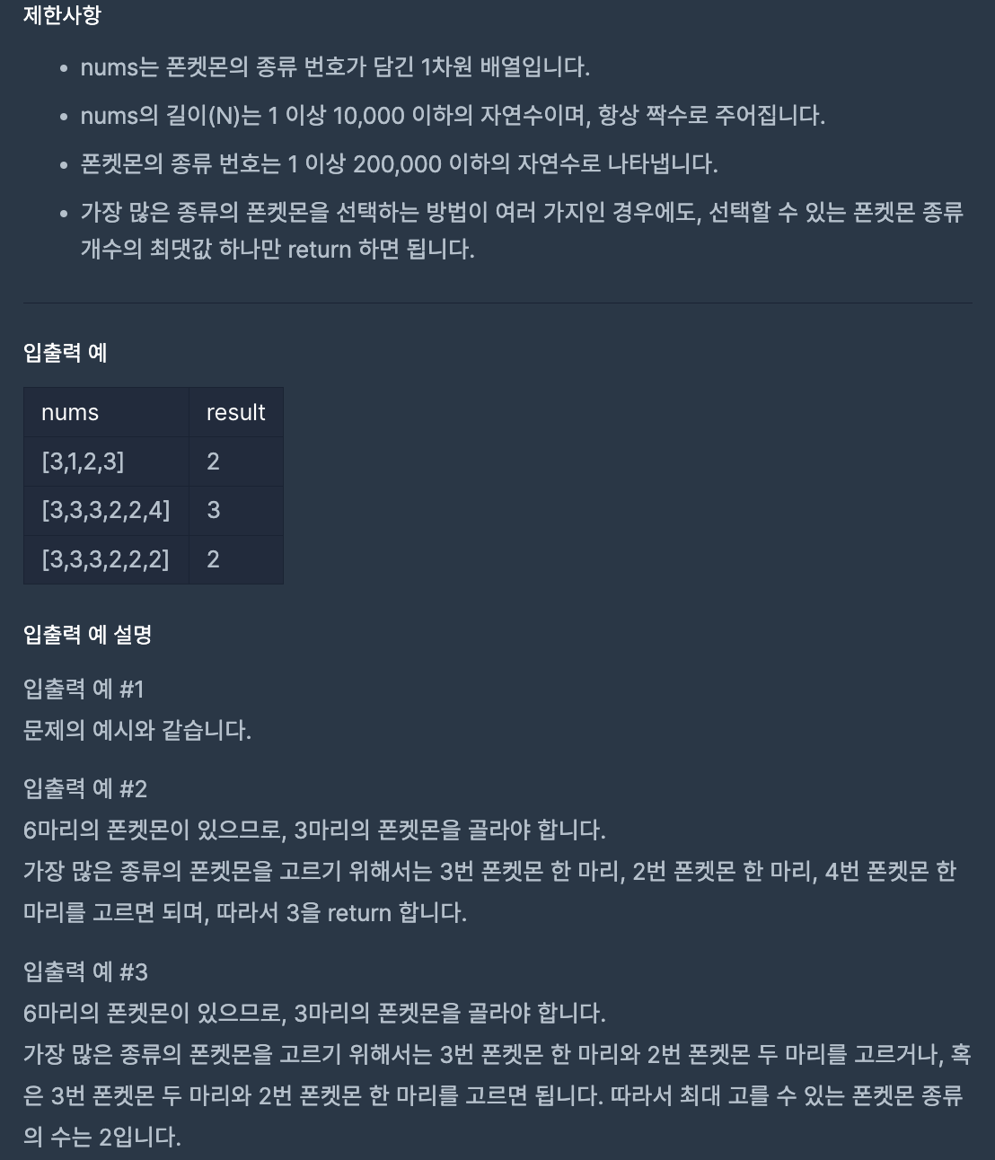 폰켓몬의 종류 번호가 담긴 1차원 배열 nums가 주어진다.