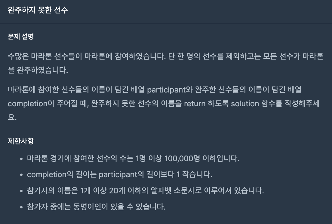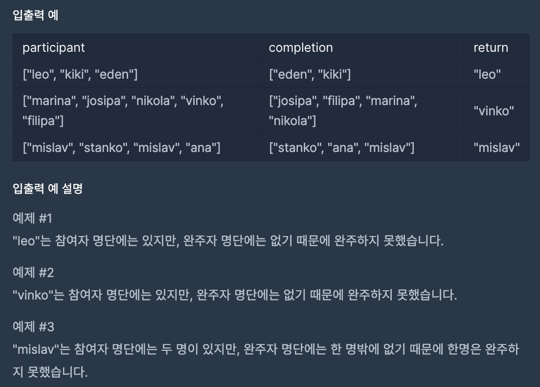 마라톤에 참여한 선수들의 이름이 담긴 배열 participant와 완주한 선수들의 이름이 담긴 배열 completion이 주어질 때,