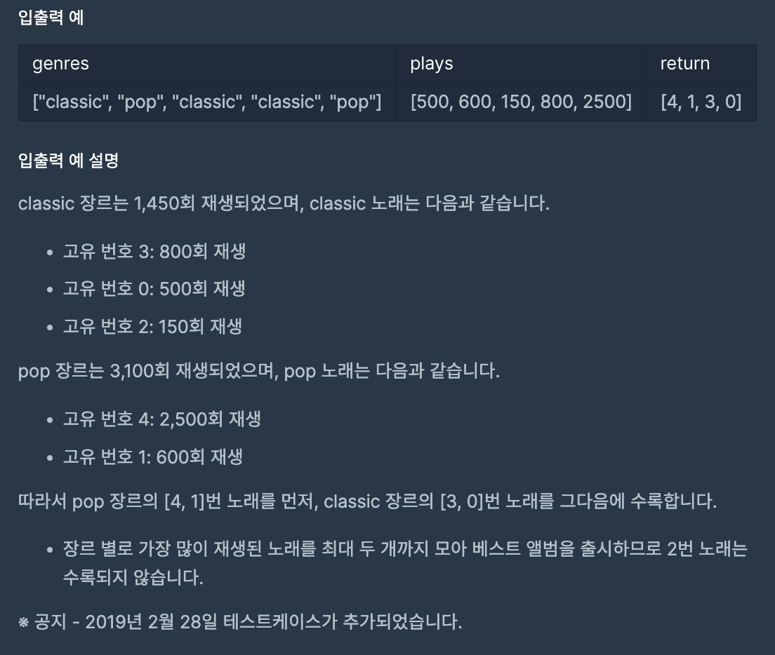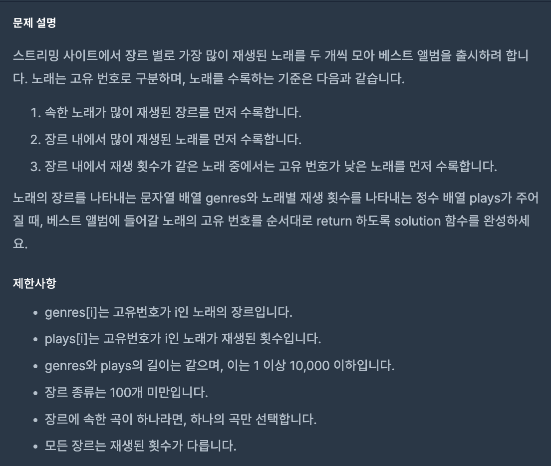 장르를 나타내는 문자열 배열 genres와 노래별 재생 횟수를 나타내는 정수 배열 plays가 매개변수로 주어질 때, 앨범에 수록될 노래의 고유 번호를 순서대로 구하라는 문제이다.