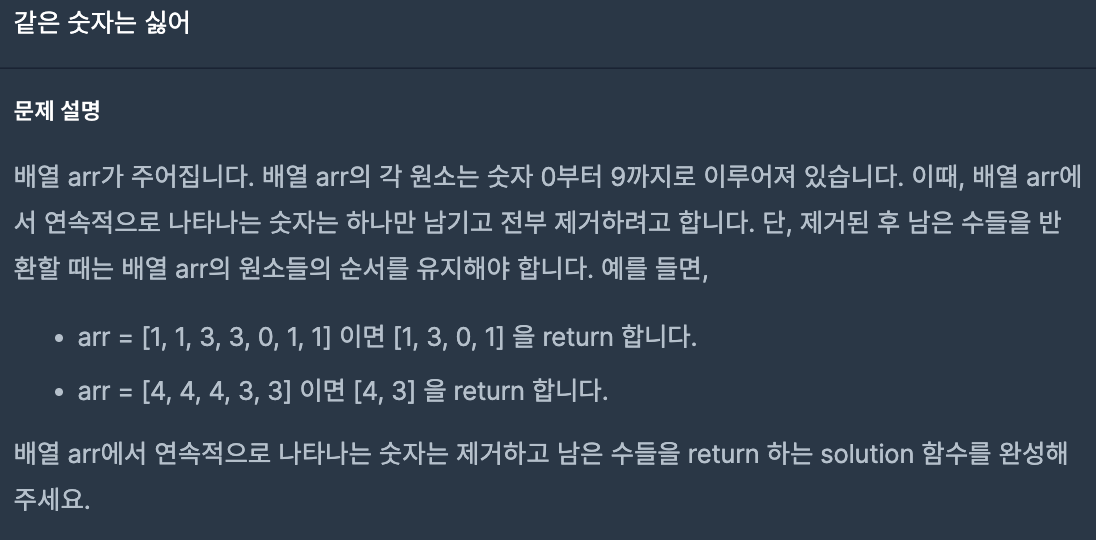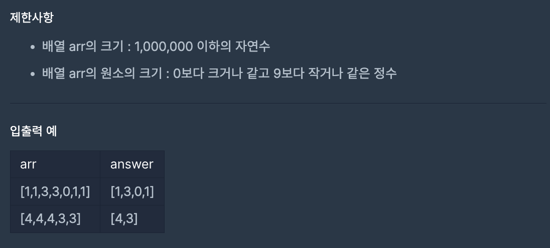 각 원소가 0부터 9까지로 이루어져 있는 배열에서 연속적으로 나타나는 숫자를 제거하고 남은 수들의 배열을 반환하라는 문제이다.