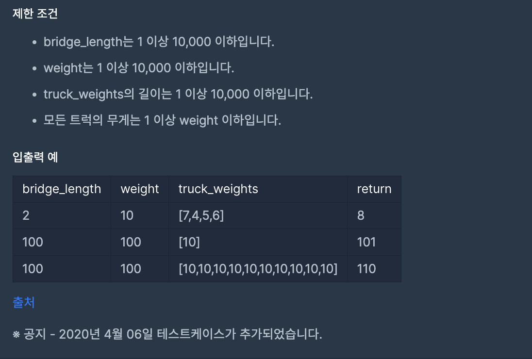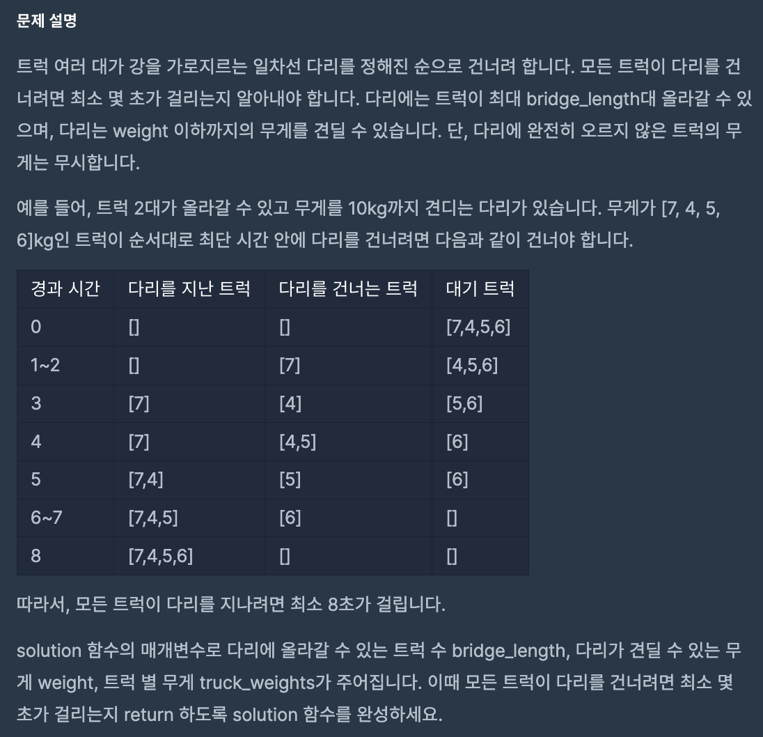 그리고 건너야 하는 트럭의 무게가 각각 truck_weights 리스트에 원소로 들어있게 주어졌을 때, 모든 트럭이 다리를 건너려면 최소 몇 초가 걸리는지(트럭이 다리 길이 1을 지나는 것을 1초라고 정한다.)를 구하라는 문제이다.