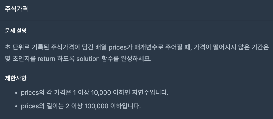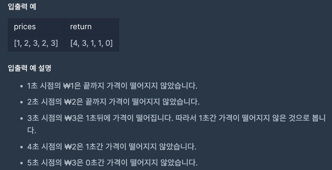 초 단위로 기록된 주식가격이 담긴 배열이 주어질 때, 가격이 떨어지지 않은 기간이 몇 초인지를 구하라는 문제이다.