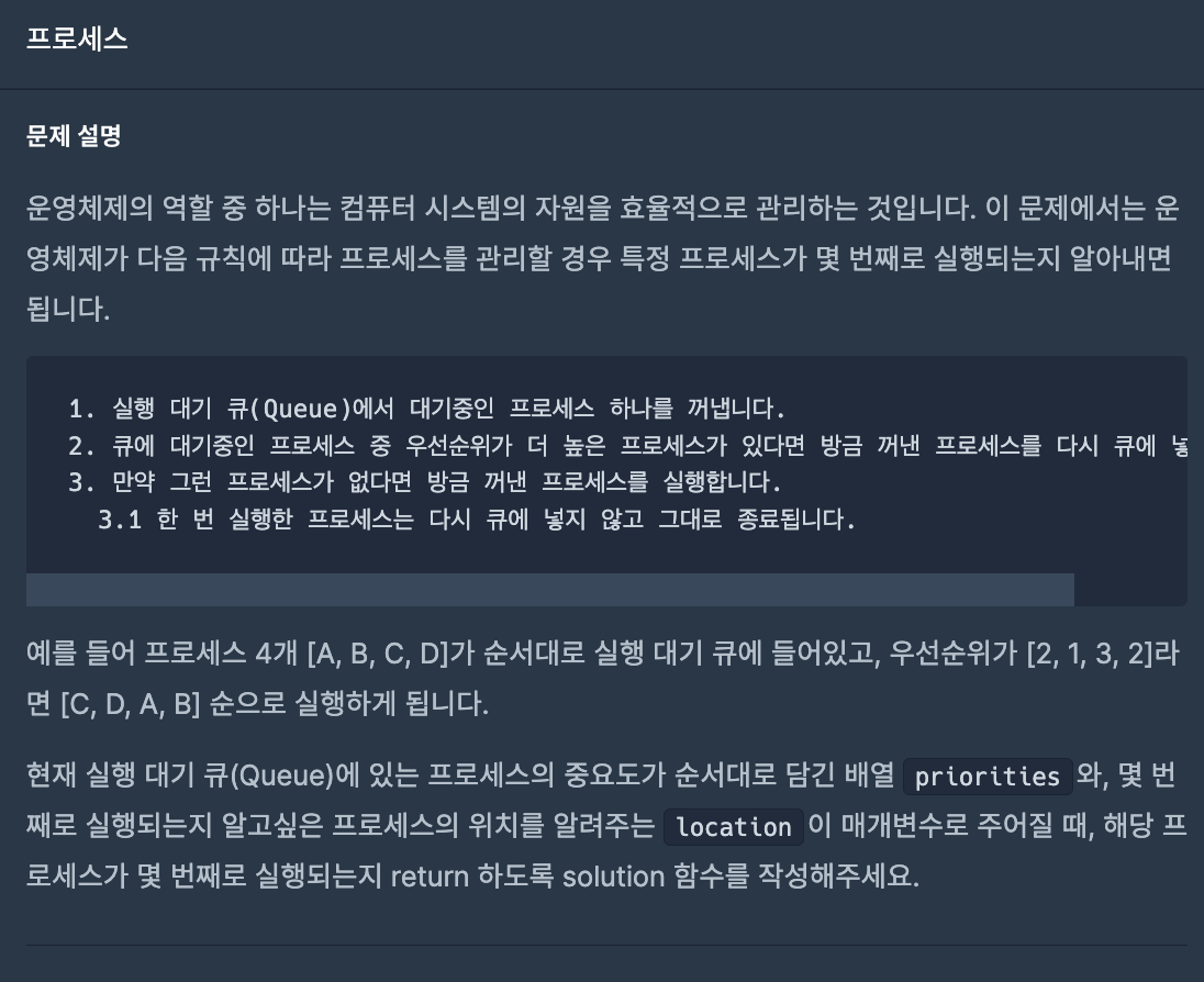 프로세스의 중요도가 순서대로 담긴 배열과, 몇 번째로 실행되는지가 궁금한 프로세스의 위치를 알려주는 정수가 주어진다.