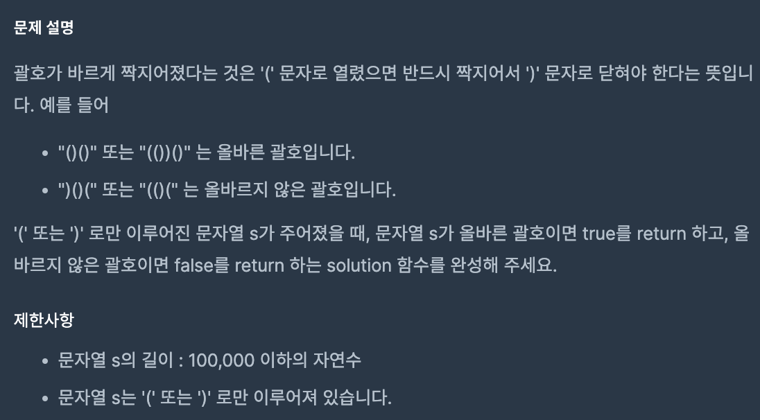 여기서 괄호가 올바르게 짝지어졌다는 것은 "(" 문자로 열렸으면, 반드시 ")" 문자로 닫히는 짝이 이루어져 있어야 한다는 것을 의미한다.