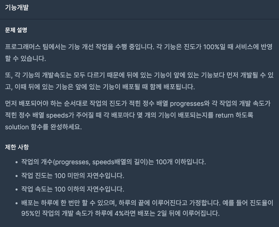 먼저 배포되어야 하는 순서대로 작업의 진도가 적힌 배열 progresses와 각 작업의 하루 기준 개발 속도가 적힌 배열 sppeds가 주어질 때, 각 배포마다 몇 개의 기능이 배포될 수 있는지를 나타내는 배열을 구하라는 문제이다.