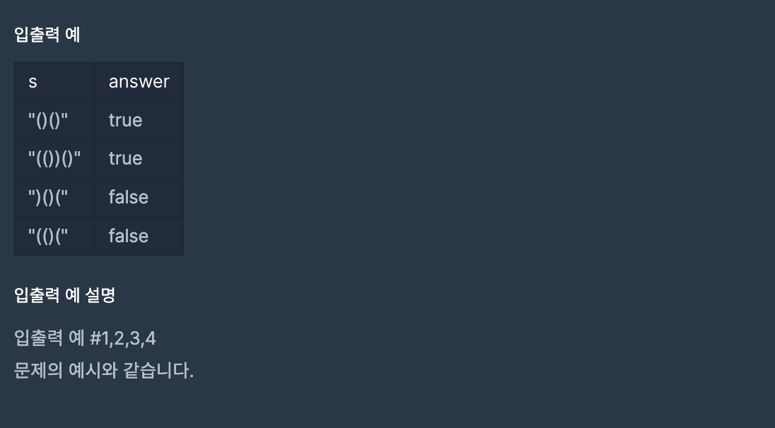 "("를 만나게 되면 카운트를 1 증가, ")"를 만나게 되면 카운드를 1 감소시켜 최종적으로는 카운트가 0이 되면 True를 반환한다. (-> 열린 괄호와 닫힌 괄호의 수가 같다는 것을 의미)