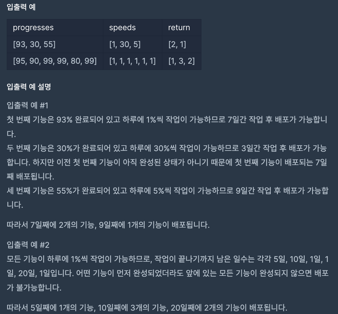 먼저 배포되어야 하는 순서대로 작업의 진도가 적힌 배열 progresses와 각 작업의 하루 기준 개발 속도가 적힌 배열 sppeds가 주어질 때, 각 배포마다 몇 개의 기능이 배포될 수 있는지를 나타내는 배열을 구하라는 문제이다.