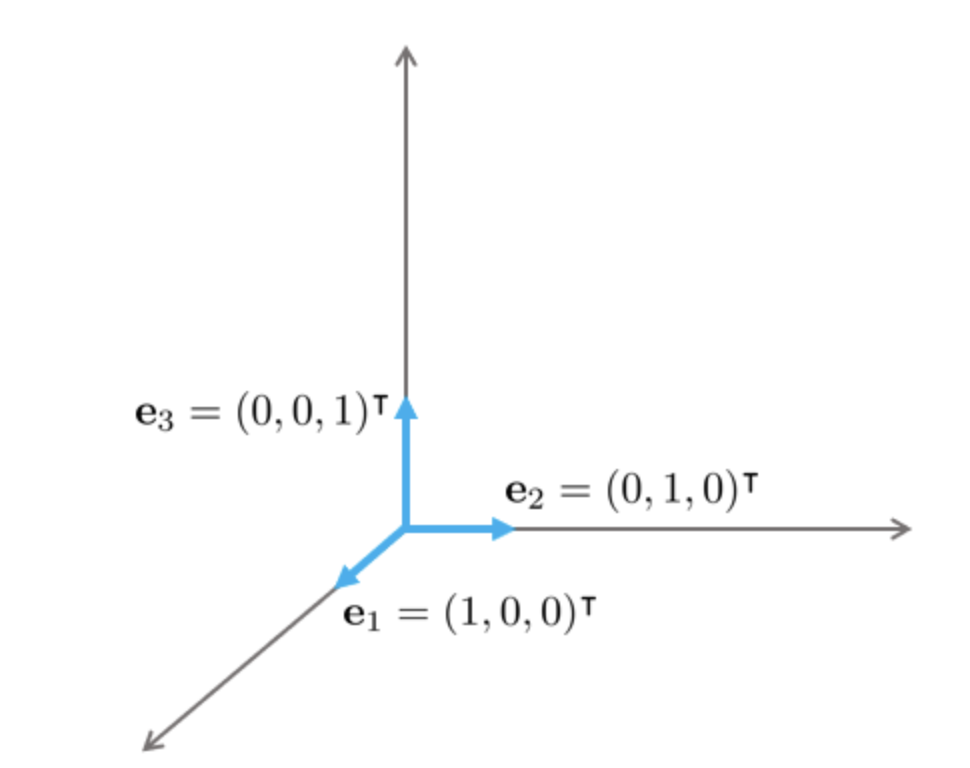 그리고 [1 0 0], [0 1 0], [0 0 1]과 같이 아래 그림에서 보이는 기저 벡터를 특별히, 표준 기저 벡터(Standard Basis Vector)라 부르게 된다.