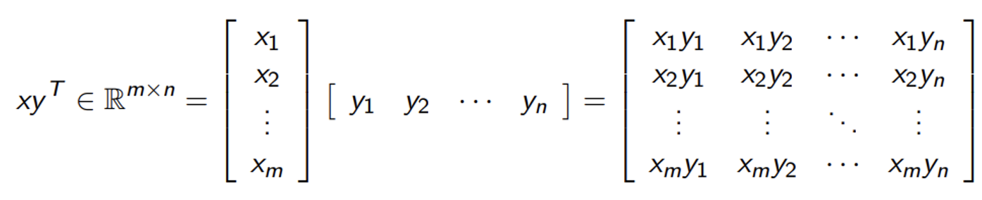 외적(Outer Product)은 두 벡터를 곱했을 때, 매트릭스(Matrix)가 나온다.