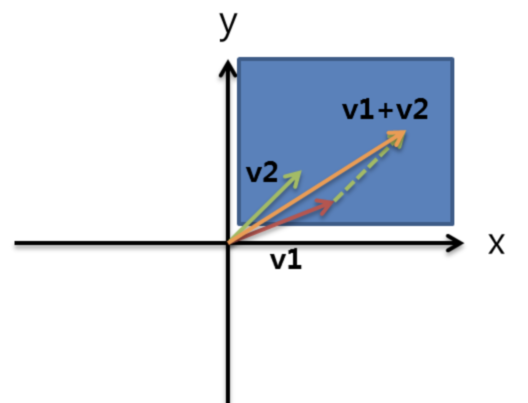 2차원 공간에서 1사분면만큼의 부분 공간만 다룬다고 가정하고, 이 공간 내의 벡터 간 덧셈 연산을 살펴보자.