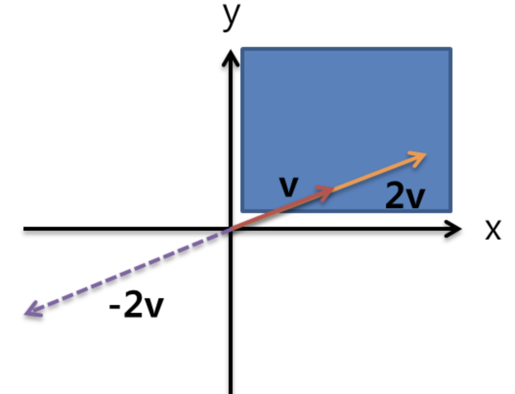 하지만 곱셈 연산의 경우, 반대 부호인 -2를 곱하게 되면 1사분면의 공간을 벗어나게 되고, 이 경우 "1사분면의 벡터 공간은 곱셈 연산에 대해 열려있다(not closure)"라고 표현할 수 있게 된다. (아래 우측 그림)