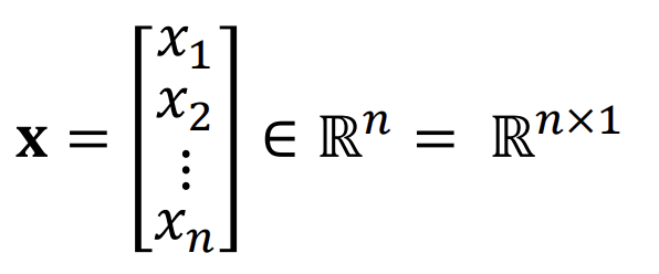세로로 기둥처럼 되어있는 벡터(n x 1)를 Column Vector, 가로로 눕혀져 있는 벡터(1 x n)를 Row Vector라고 부른다.