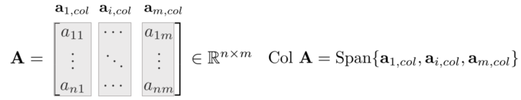 행렬 A가 존재할 때 우리는 행렬로부터 부분 공간, Column Space를 추출할 수 있다. 더 정확하게는 행렬 A의 Column Vector로 인해 Span되는 부분공간. 그것이 Column space다. Col A라고 표기한다.