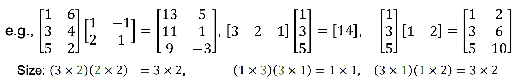 m x n 행렬과 n x r인 행렬의 곱을 하면, m x r size의 matrix가 결과값이 된다. (앞 행렬의 column 수와 뒤 행렬의 row 수가 같아야 함.)