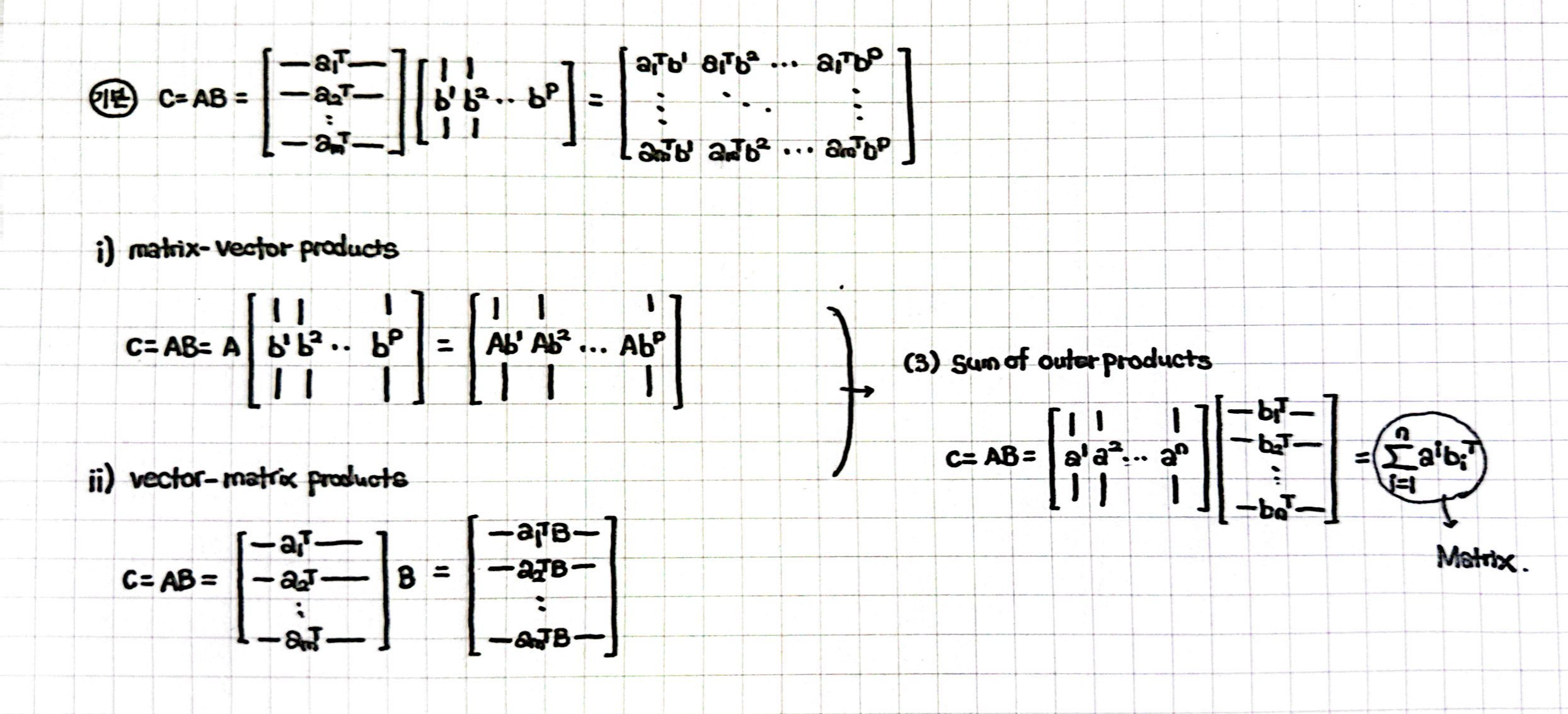 (2) 앞 matrix를 row vector로 바라봐서 a rows와 B와의 선형결합으로 바라보는 방법이 이제는 이해가 될 거라 믿는다.