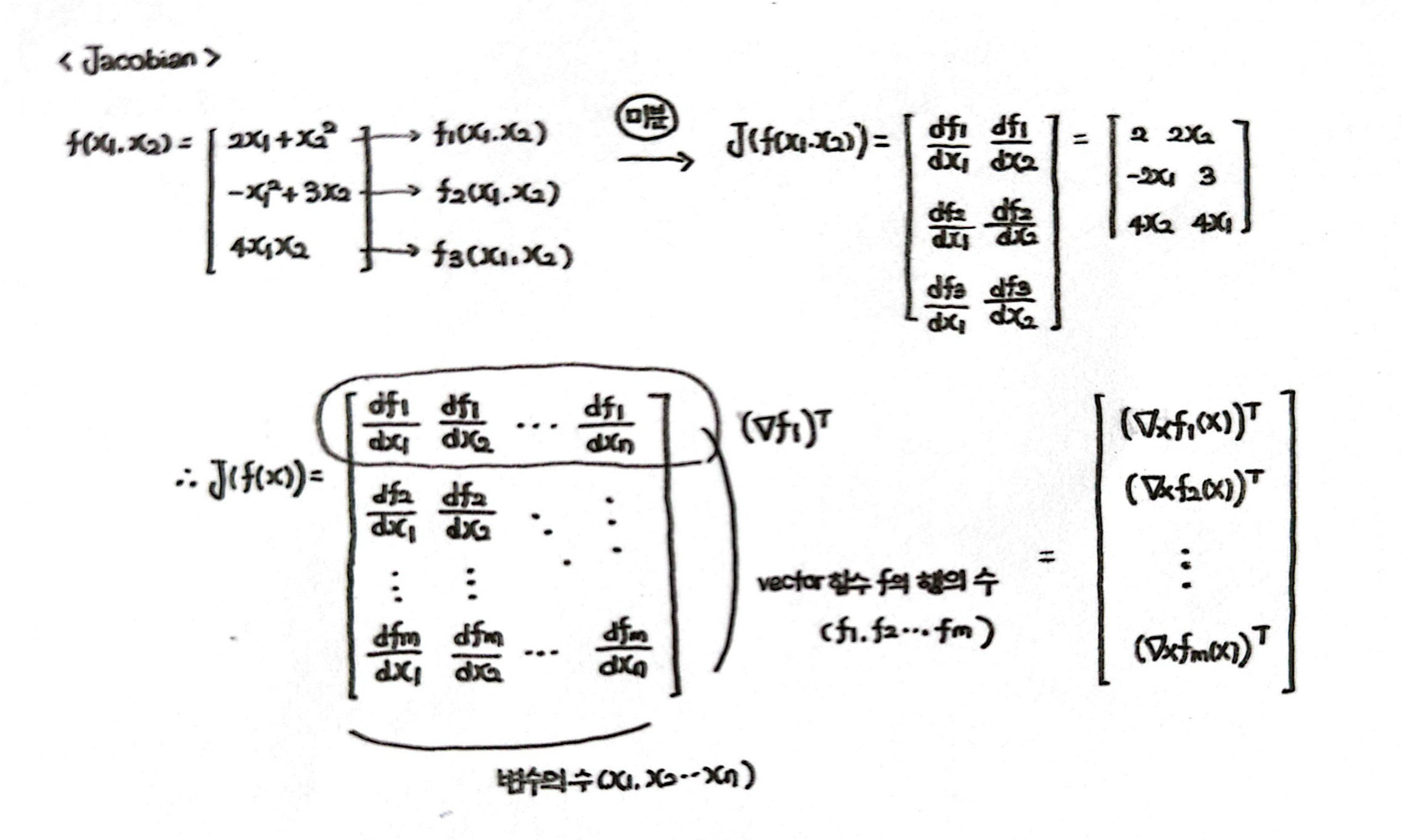 즉, Jacobian은 벡터 함수(변수가 여러 개인 함수) 각각의 Gradinet값을 다시 vector로 쌓은 것을 의미한다.