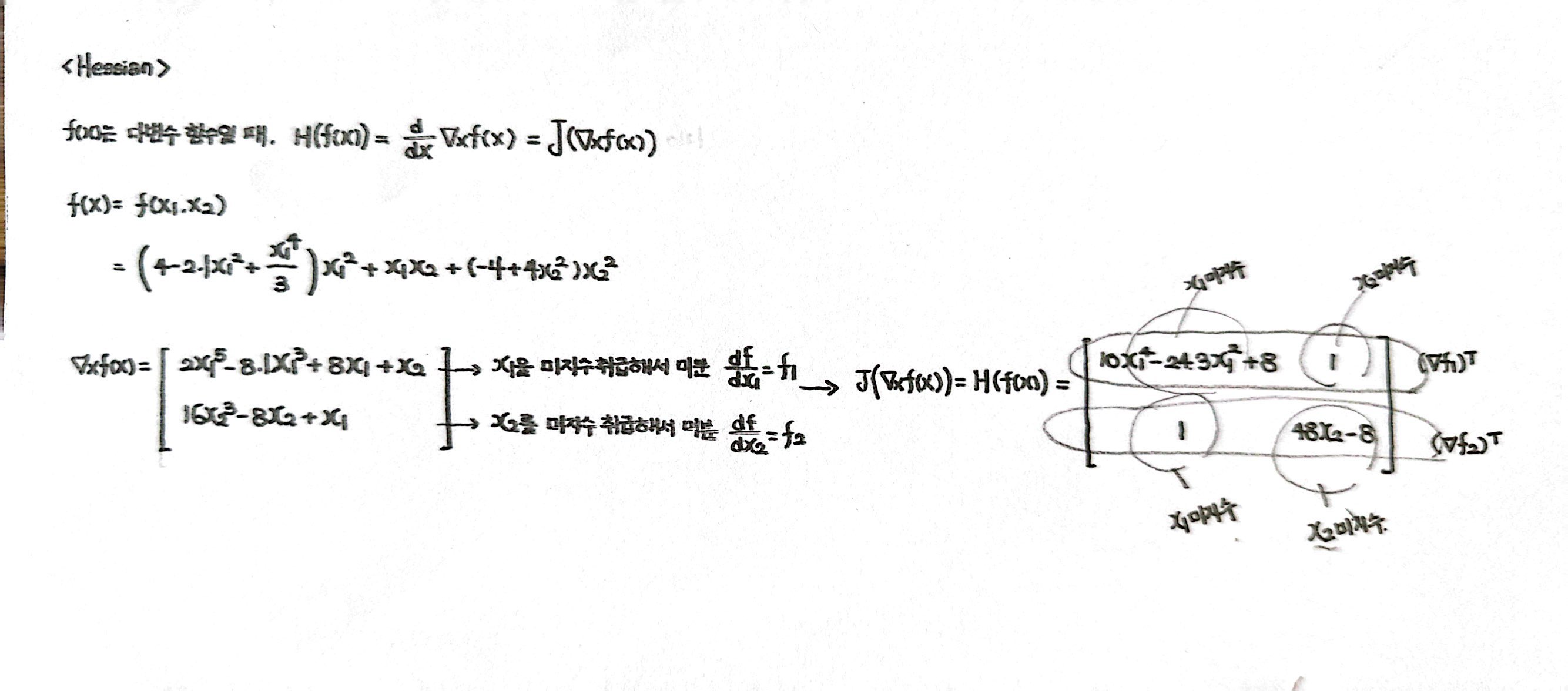 2️⃣번 파트에서 배웠던 다변수 함수(x~vector, y~scalar)를 2번 미분하는 것을 Hessian이라고 부른다.