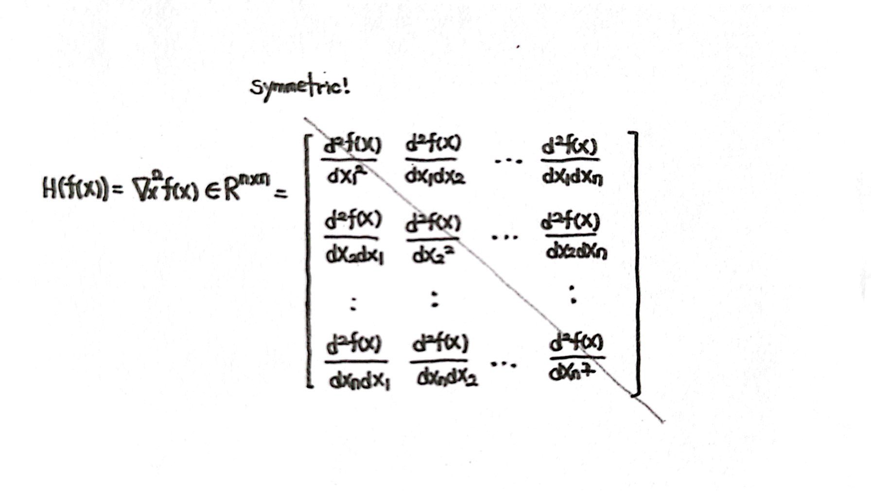 최종적으로 도출되는 Hessian 값은 대각선을 기준으로 대칭인 symmetric 하다는 성질을 가지고 있다는 것까지 알아두도록 하자!