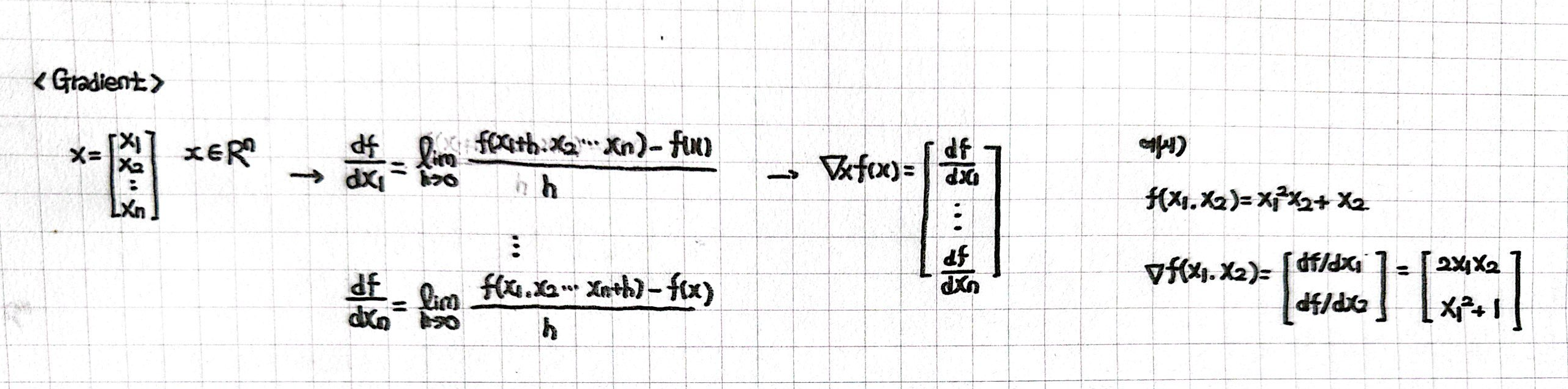 즉, Gradient란 다변수 함수 f를 n개의 변수 각각에 대해 편미분한 scalar값을 vector로 쌓은 것을 의미한다.