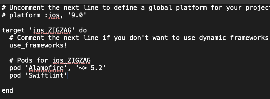 3. 생성된 Podfile이라는 파일을 열어, 추가하고자 하는 라이브러리를 입력하고 저장한다.