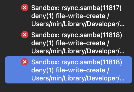 "Sandbox: rsync.samba(number) deny(1) 파일 경로"가 나오는 이상한 알 수 없는, 예전에는 없던 에러에 나는 당황하게 된다.