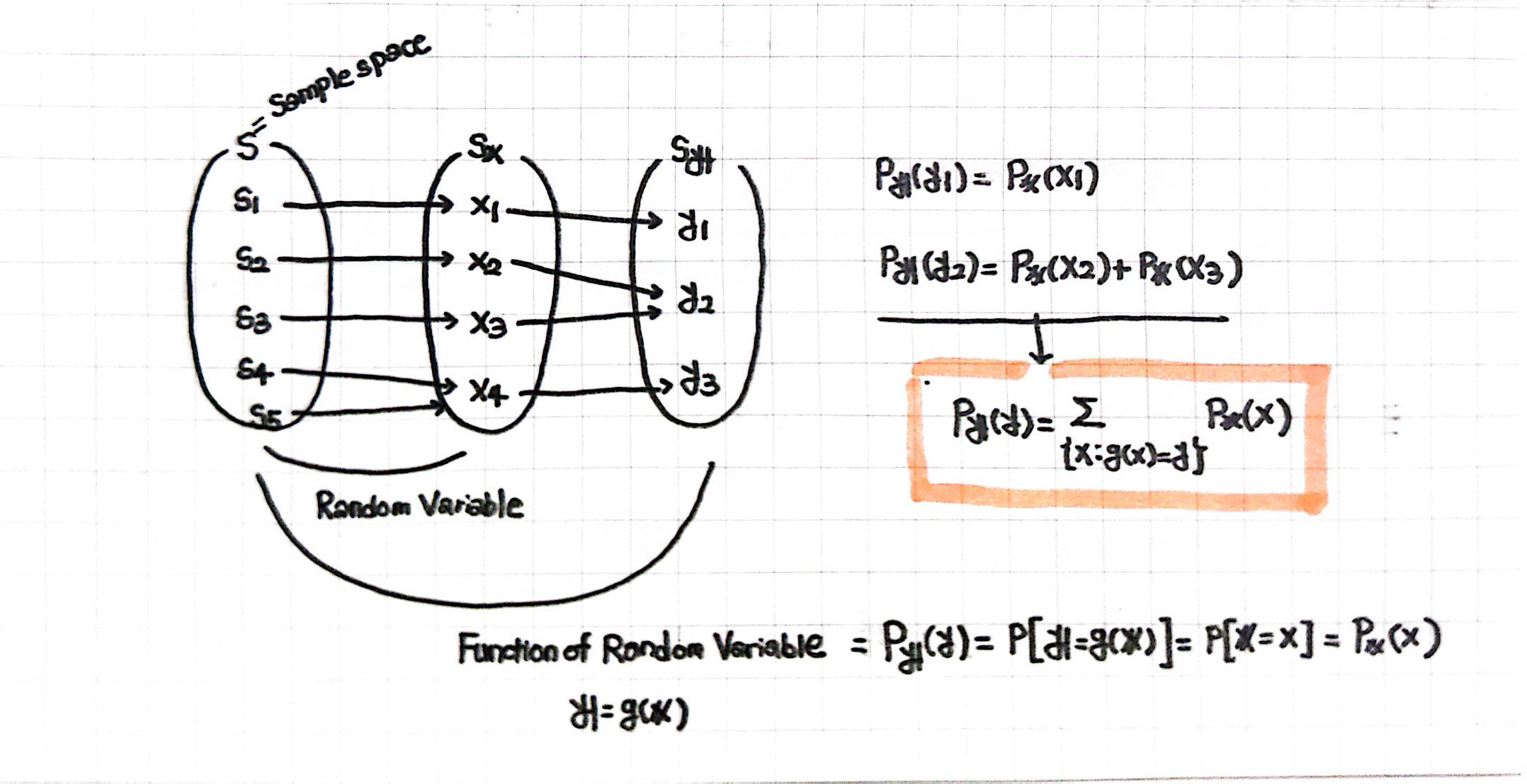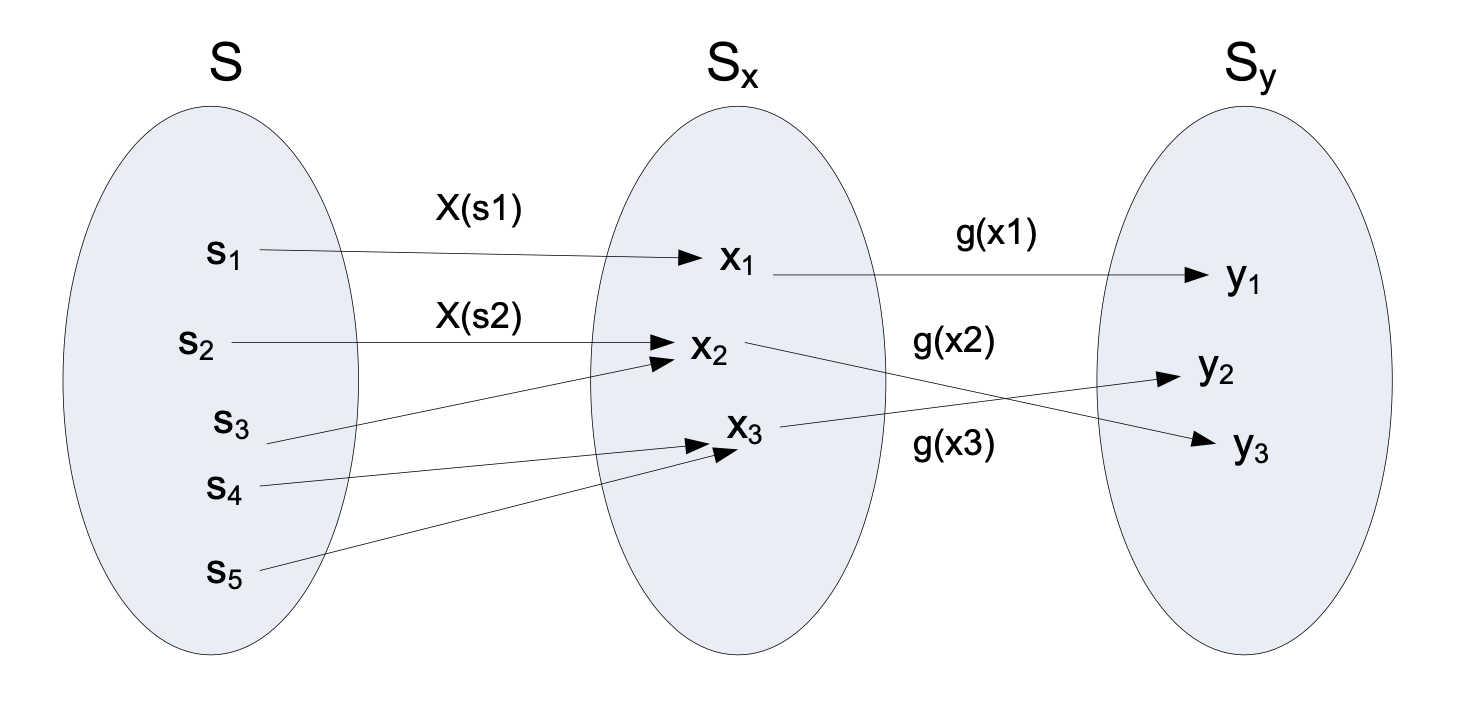 표기는 y = g(x)와 같이 사용할 것이며, 함수를 통해 유도되는 Random Variable y 각각의 sample value y는 다른 Random Variable x 각각의 sample value x의 수학 함수 g(x)라고 설명할 수 있겠다.