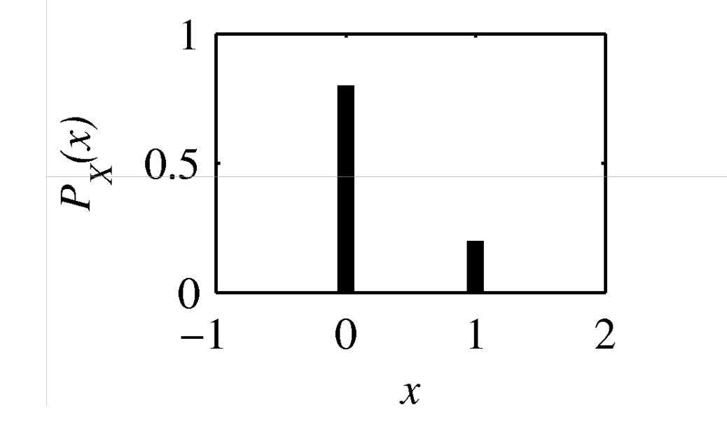 PMF의 x가 0일 때와 1일 때 2가지 경우만 있으며, x가 1일 때는 p, 0일 때는 전체 확률 1-p를 갖는 간단한 RV이다. 두 가지 경우를 가지는 실험에 대해서 적용하기 적합한 Random Variable이다. (동전의 앞면과 뒷면, 주사위 짝수와 홀수 등)
