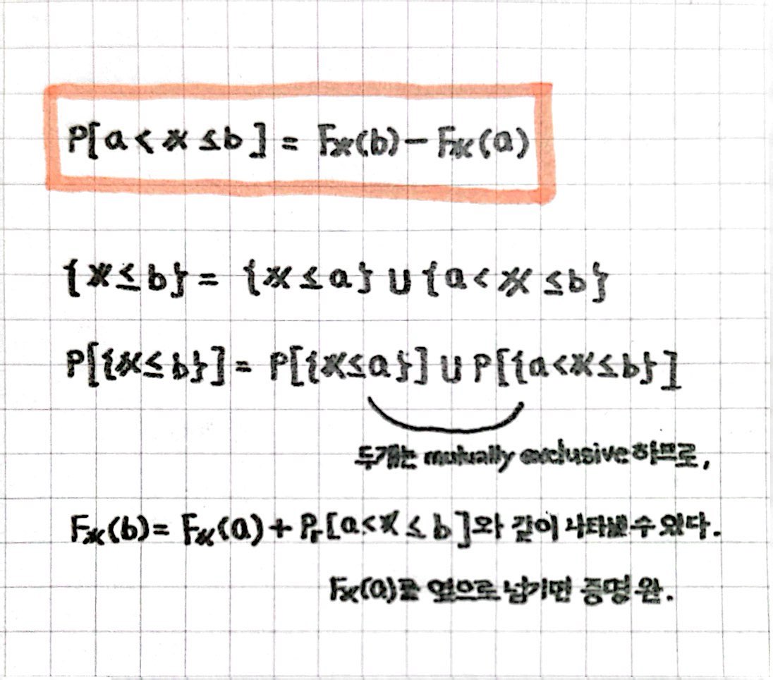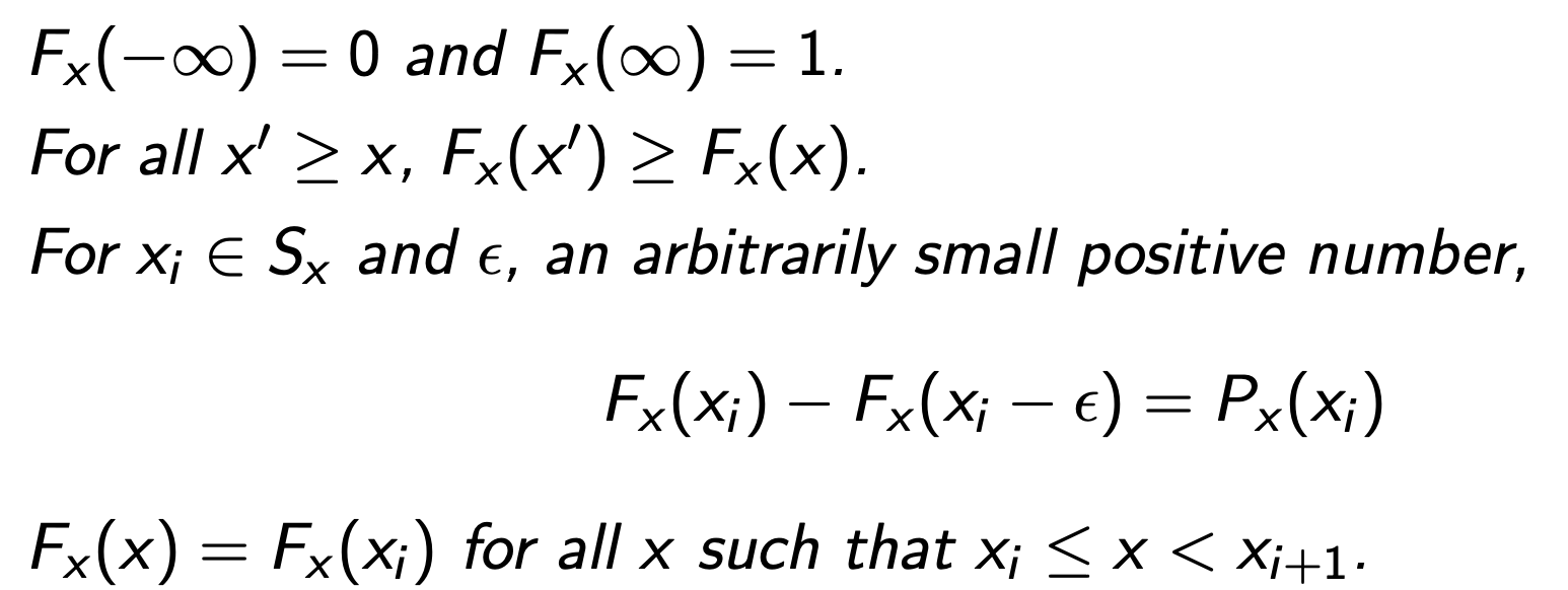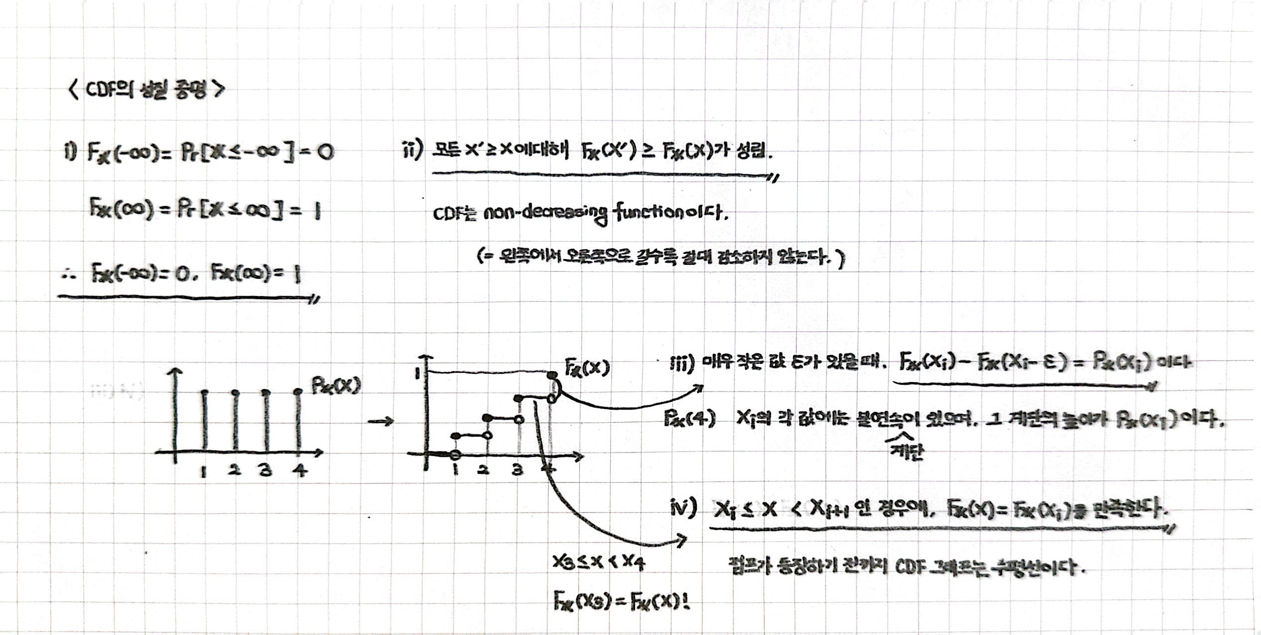 - CDF는 0에서 시작해서 최대 1로 끝나는 함수이다. -> PMF의 성질 (1), (2)에 대한 영향