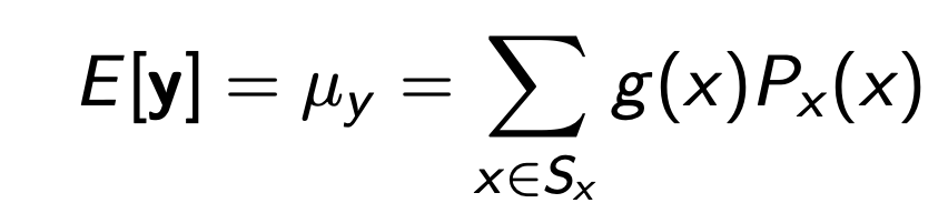 Expected Value E[y]는 sample space에 속하는 x에 대해 g(x)와 x의 PMF 값을 곱한 값들의 전체 합으로 구할 수 있다.