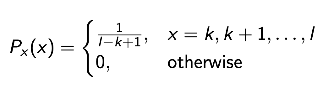 모든 outcome들이 동일한 확률로 분포되어 있는 경우를 나타내며, l은 실험의 최댓값 k는 실험의 최솟값이 들어가는 부분이다.