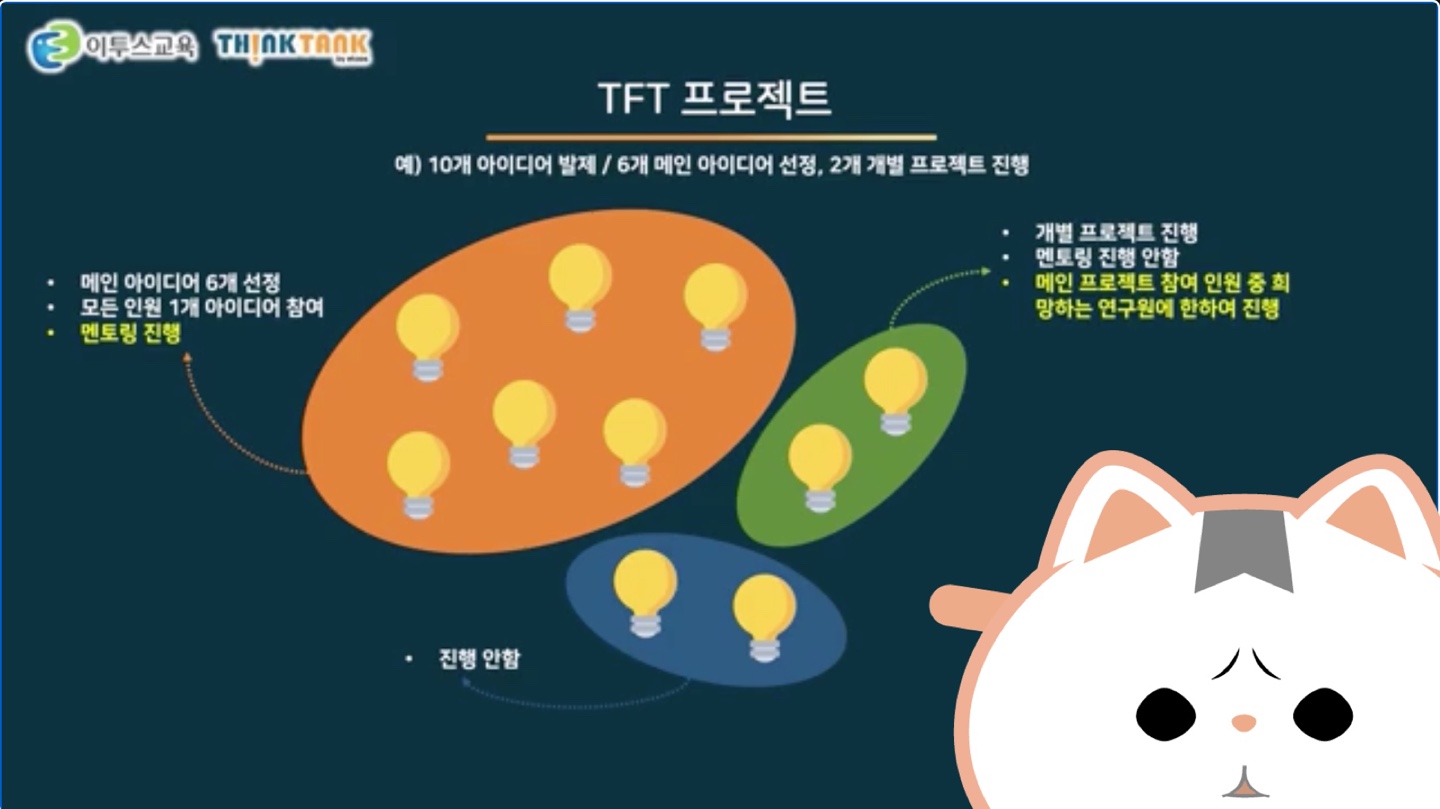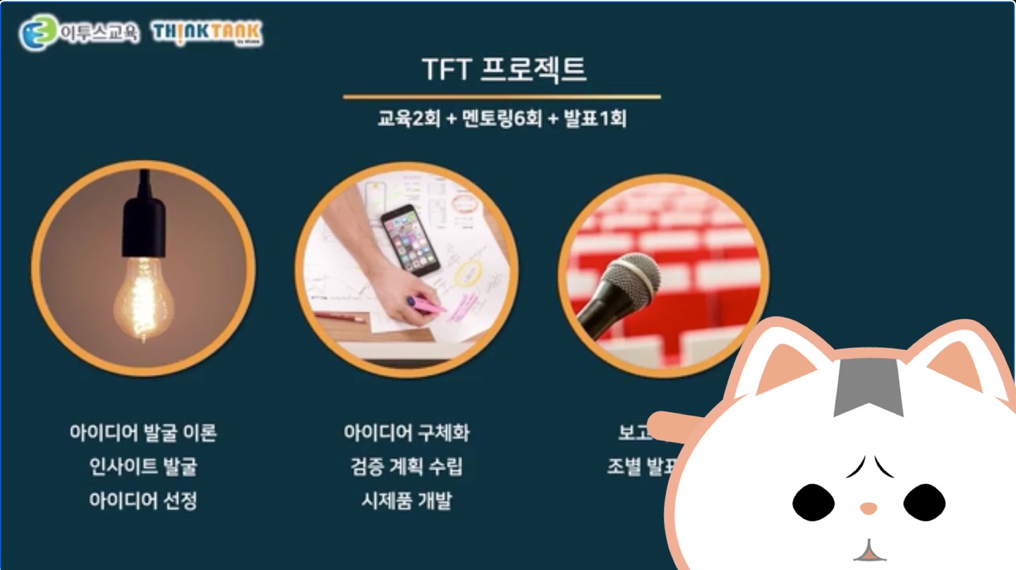 우리 같은 경우에는 대학생들이 창의적인 아이디어를 제안해 최종 시제품까지 개발, 검증까지 진행하고자 하는 목적으로 싱크탱크 팀이 구성되었다. 애초에 처음 이투스교육에서 싱크탱크를 모집했던 것이 이 TFT 프로젝트를 위함이라 해도 과언이 아니었다.