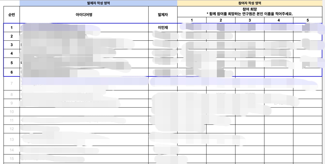 여담이지만, 다른 연구원분들이 보통 아이디어 제안서를 보고 각자 마음에 드는 아이디어를 골라 이름을 적는 팀빌딩 방식 때문에 한편으로 설레기도 하면서 두렵기도 했다.