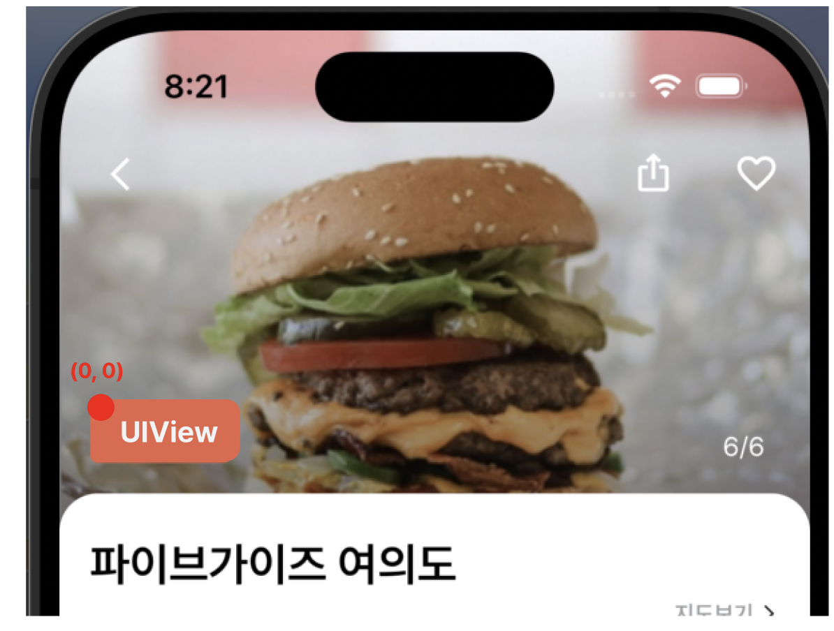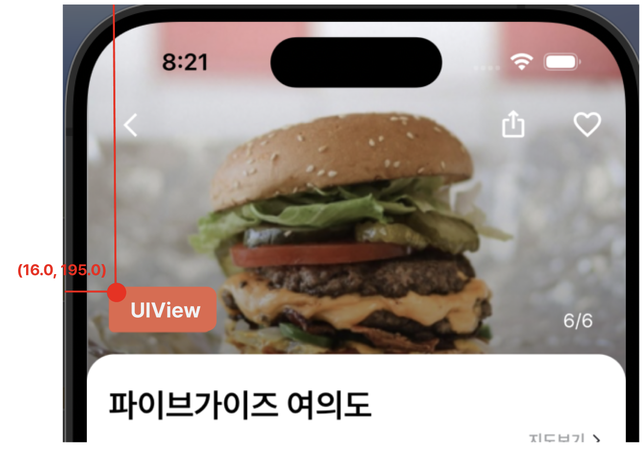 frame은 자신보다 상위 계층의 뷰(superview)를 기준으로 위치가 표현되기 때문에 superView인 ImageView의 origin 위치(0, 0)를 기준으로 잡히는 것을 확인할 수 있다. -> 아래 UIView의 origin은 imageView의 origin x로부터 16만큼, origin y만큼 195만큼 떨어져 있음