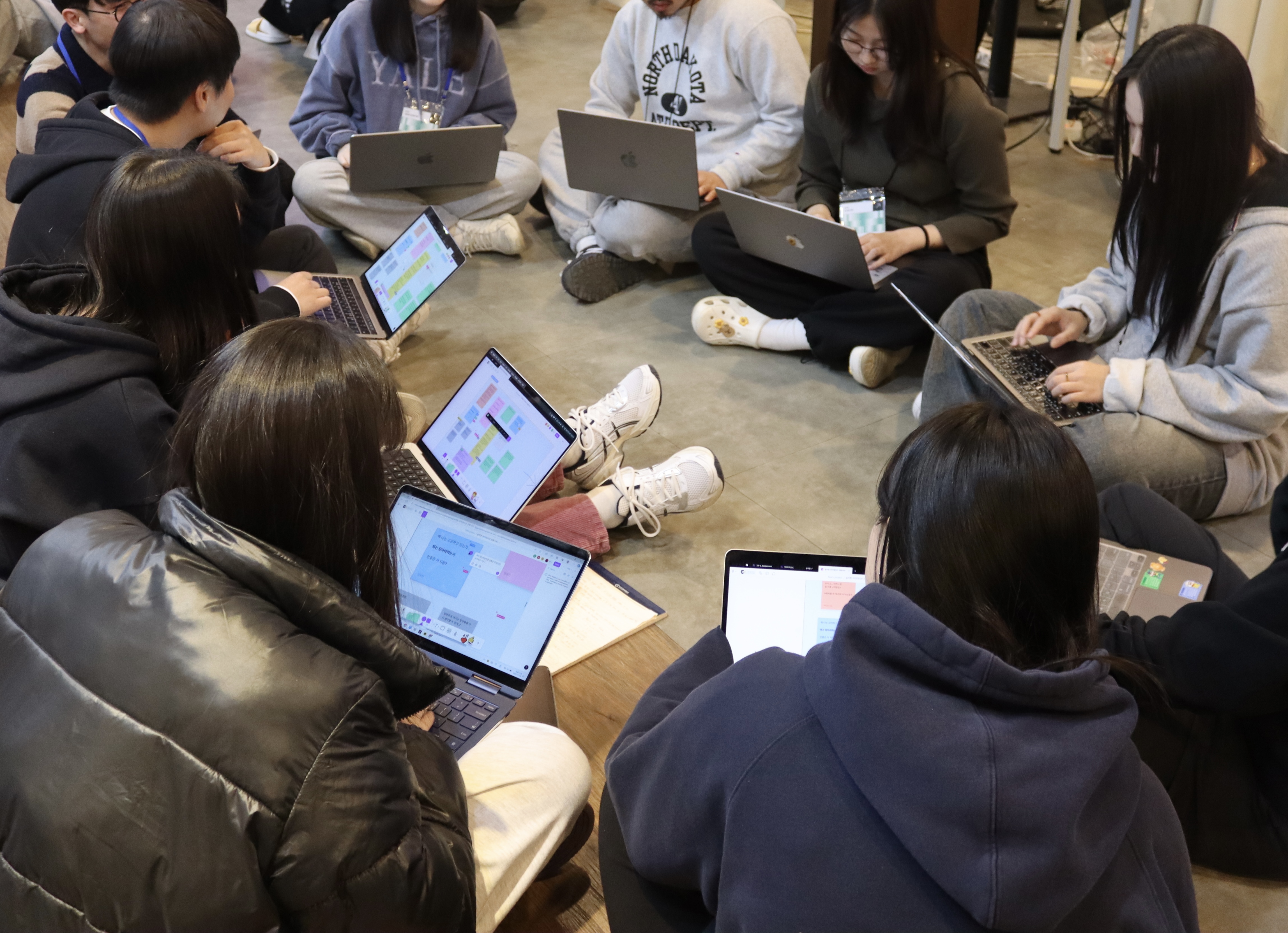 각자의 노트북을 들고 앉아있던 자리에서 내려와, 바닥에 옹기종기 모든 팀원이 둘러앉아 아이데이션을 시작했다.