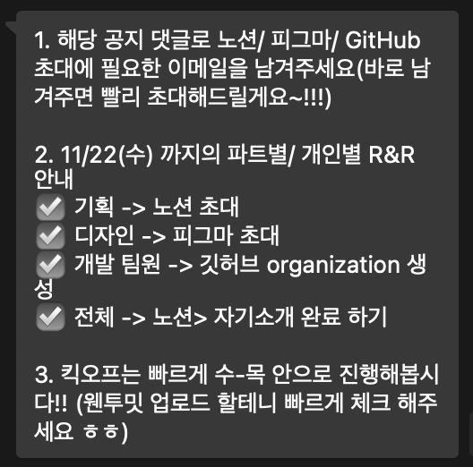 : 협업을 위한 노션 페이지와 피그마, 깃허브가 공유돼야 한다.