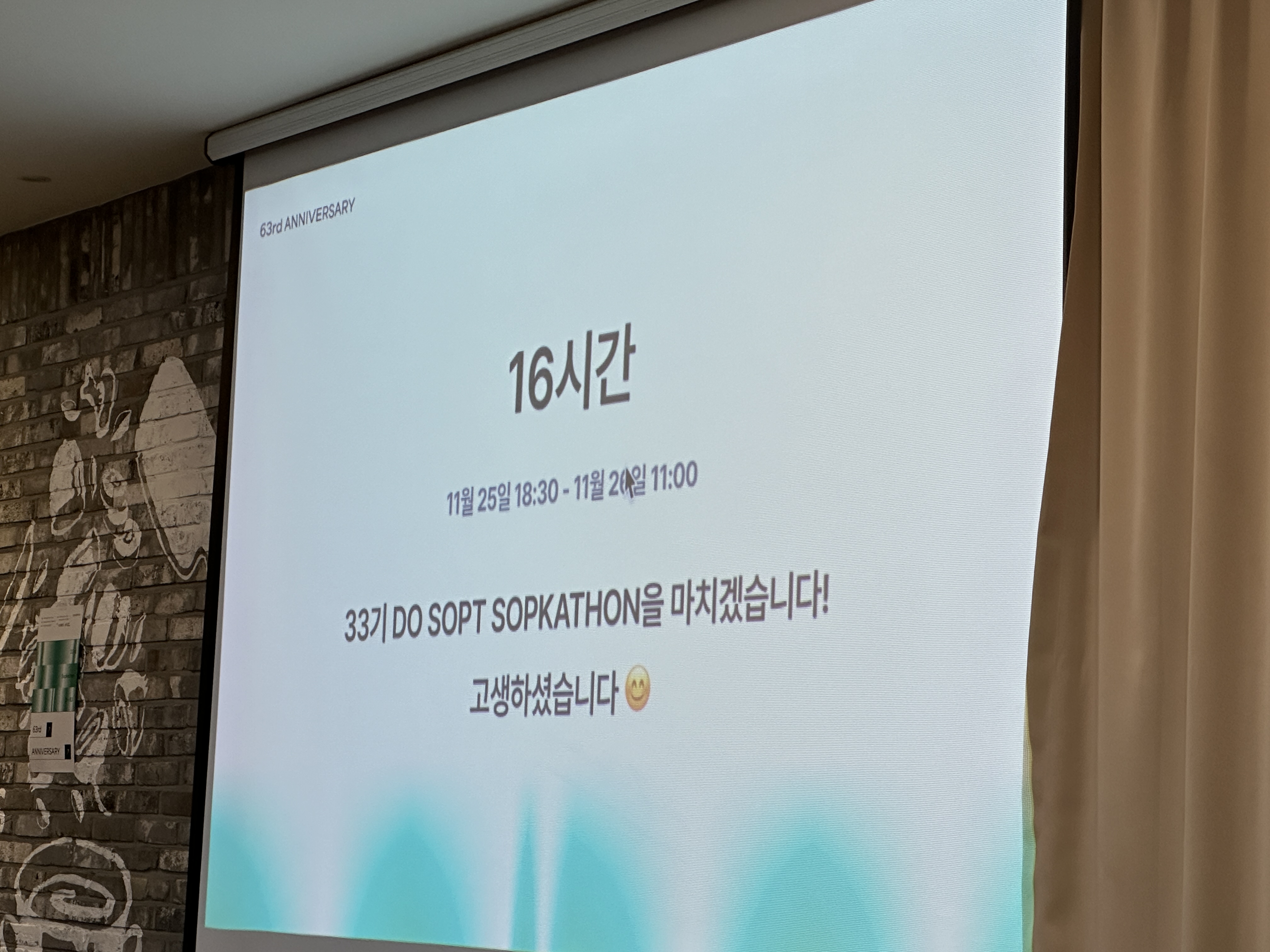 각 조별 조장의 발표 순서가 되면, 힘내라고 구호를 외쳐주는 것이 국룰(?)이었는데 우리 조는 "솝커톤은 기세다~~!"라고 외치면서 힘을 실어 주었다. (사실, 이때 너무 지친 상태여서 거의 대부분 눈이 반 감긴 상태로 행사를 진행하고 구호를 외친다.)