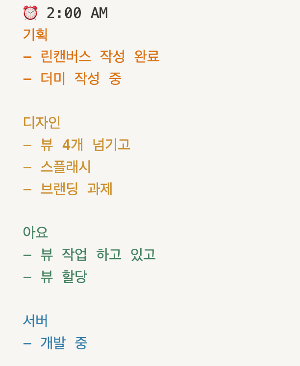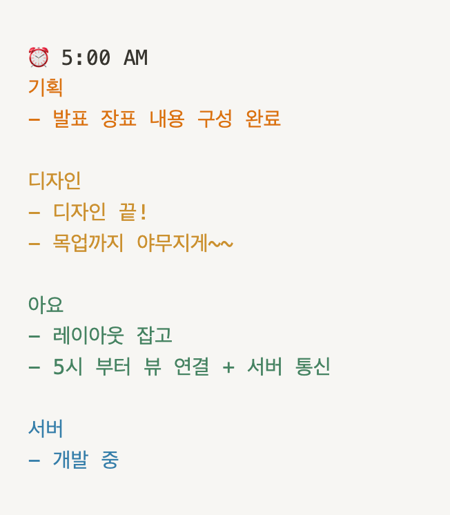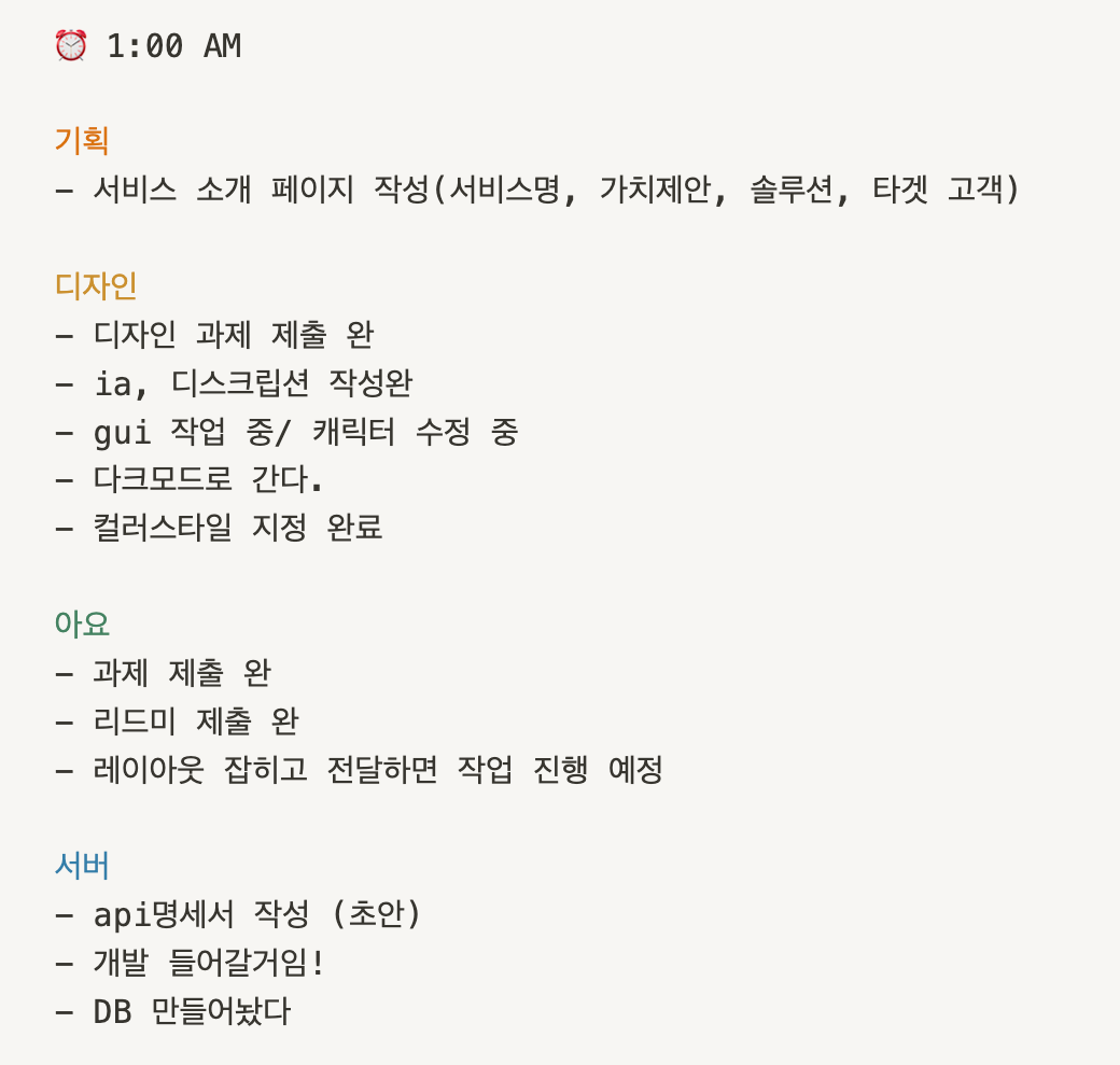 + 물론, 첫 클라이언트 리드의 부담감으로 "디자이너 서버 선생님들이 만들어주신 소중한 결과물들을 무조건 프로덕트로 완성시키기."가 더 머릿속 깊게 자리하고 있던 (차마 입 밖으로 꺼내지 못했던) 내 0번 목표였다.