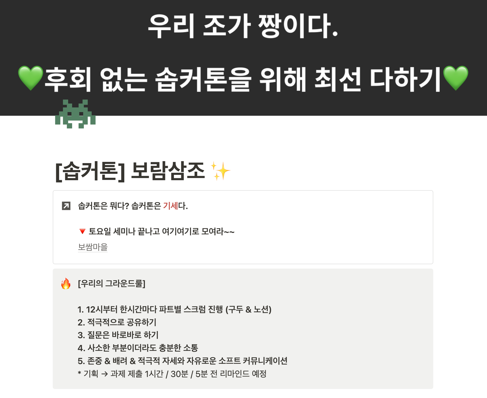 (처음 팀 노션을 만들었을 때부터 쓰여있던 "솝커톤은 기세다"라는 말이 너무 인상 깊었던...)