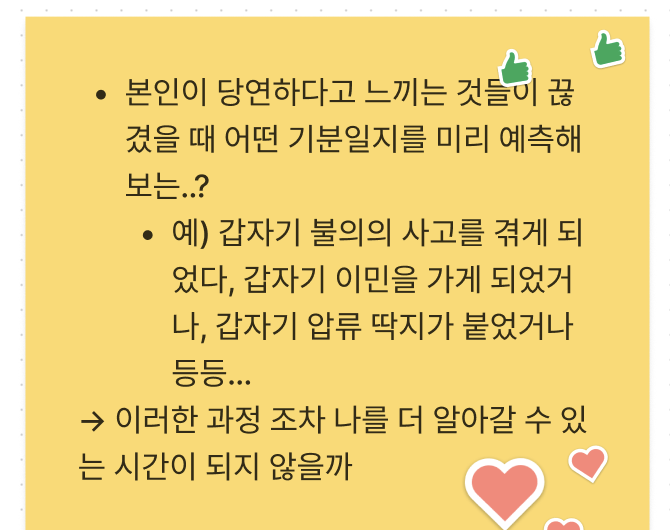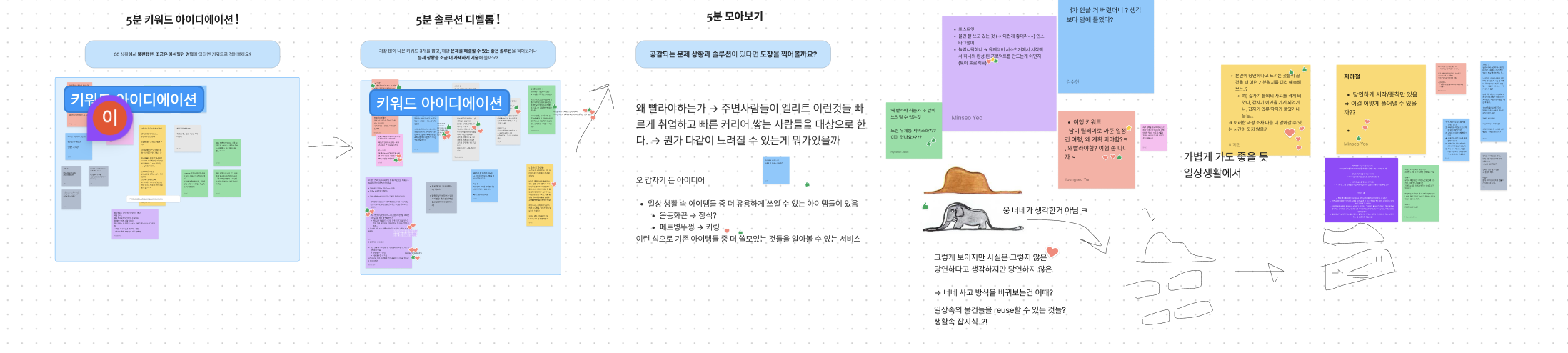 5분 정도 각자 생각했던 아이디어를 돌아가면서 발표하고, 이를 다시 5분 동안 구체적으로 생각해서 발표하고,,, 계속 반복의 과정이었다.