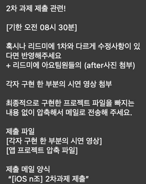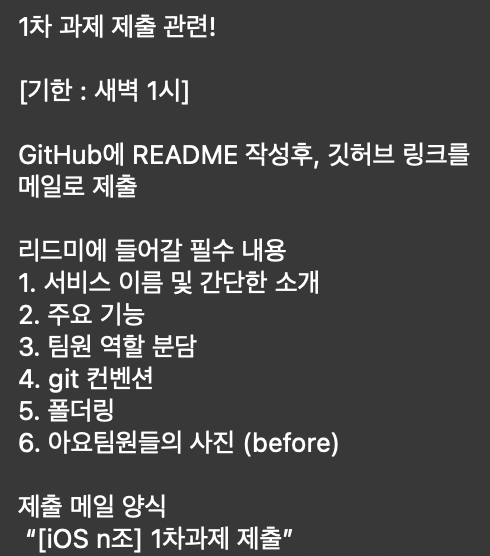 1시에 제출해야하는 iOS 파트의 1차 과제도 개발 내용보다는 협업시에 필요한 규칙을 정해 리드미를 작성하는 것이 주된 내용이다.