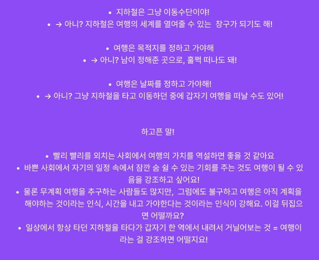 "여행은 왜 꼭 거창해야 하는 걸까? 우리가 일상에서 타는 지하철로 여행의 의미를 재정의할 수 있지 않을까?"라는 의미에 여행 서비스일지 지하철 서비스일지 모르는 아이디어 하나.