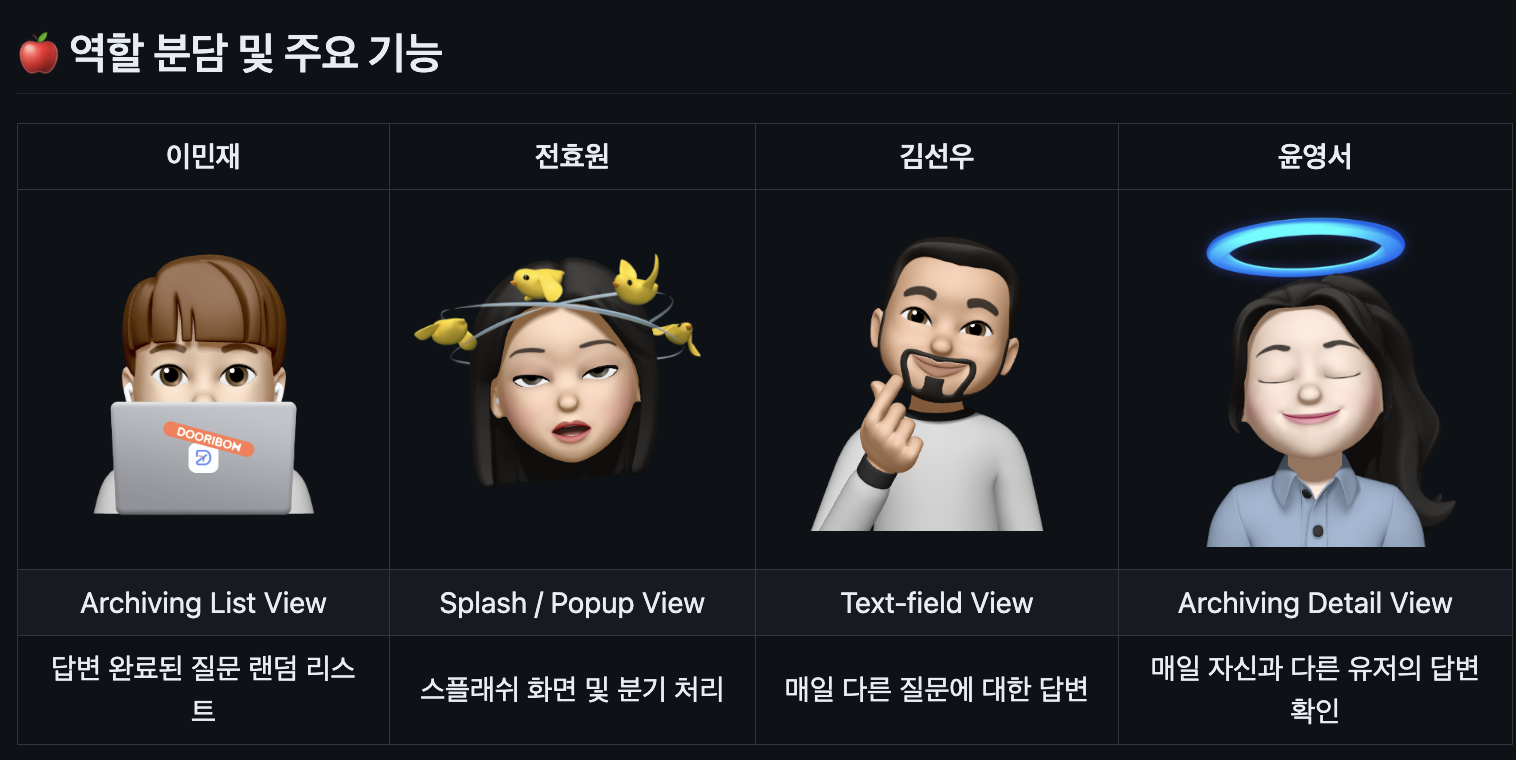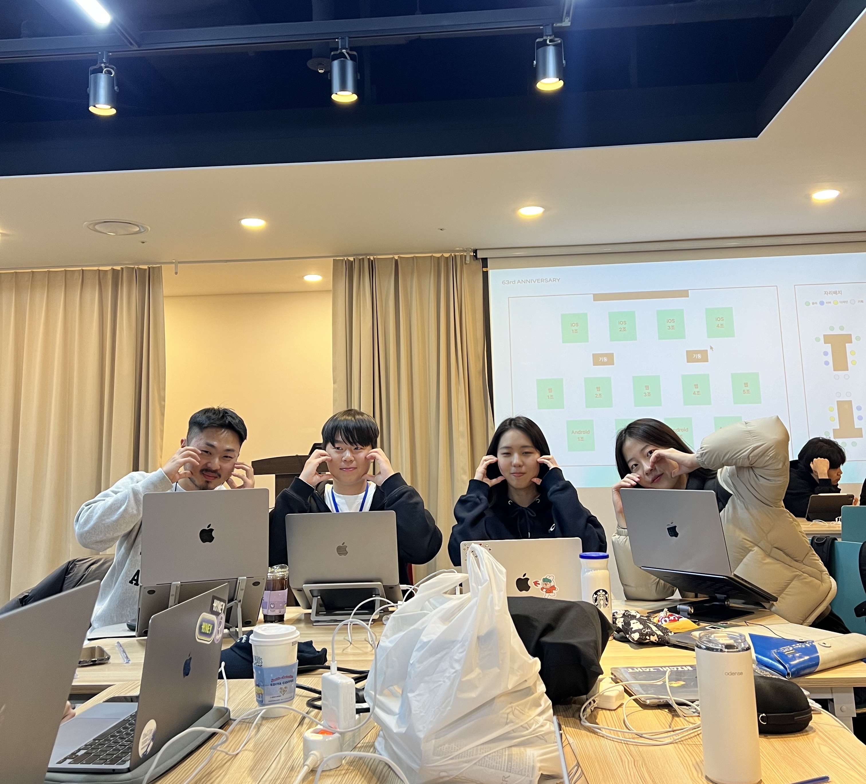 팀 분위기를 이끌고 그 누구보다 걱정 많았을 기획, 멋진 도전정신과 말만하면 뚝딱 나오던 놀라운 실력의 디자인, 끝까지 책임있는 자세로 결국 목표를 달성해낸 서버, 그리고 배울 점이 정말정말 많았던 멋있는 우리 아요까지.