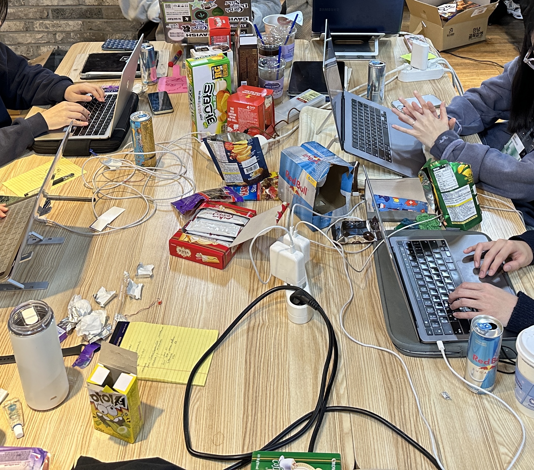 보통 저녁식사를 하고 행사장까지 가는 길에, 팀별로 밤을 새우면서 먹게 될 간단한 간식거리나 커피, 몬스터 등을 사들고 간다.