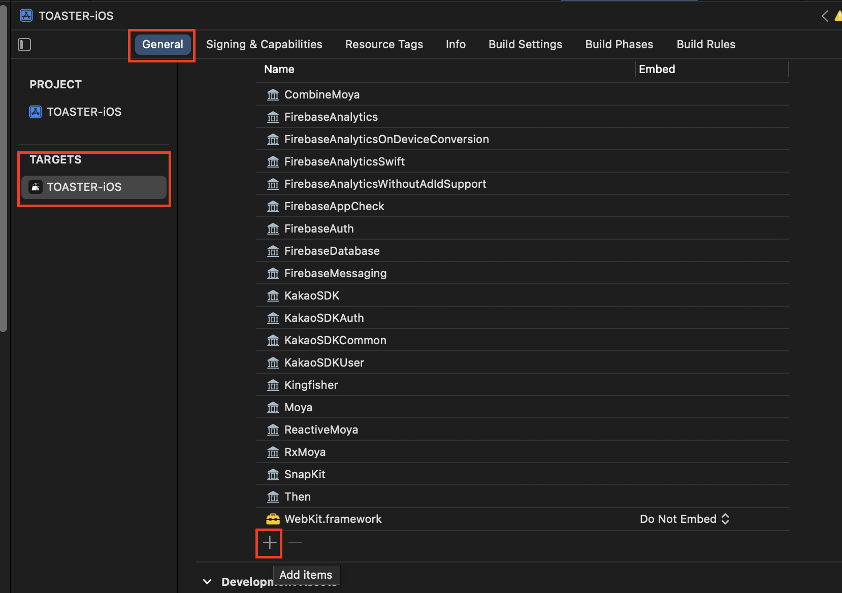 프로젝트 설정 파일 -> Targets 클릭 후, General 탭 진입 -> Frameworks, Libraries, and Embedded Content -> + 버튼 클릭 -> Apple SDKs에 들어있는 WebKit.framework 추가