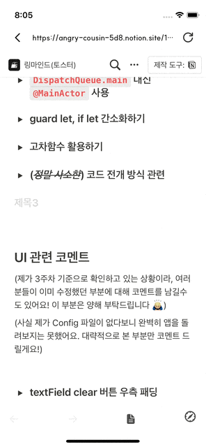 웹 뷰의 변경이 감지되었을 때, progressView의 progress 속성(NSNumber 타입의 변환과 Float 형변환이 이루어진다.)을 업데이트시키고, 그에 따라 progressView의 상태도 동시에 바뀌는 식으로 코드를 구현했다.