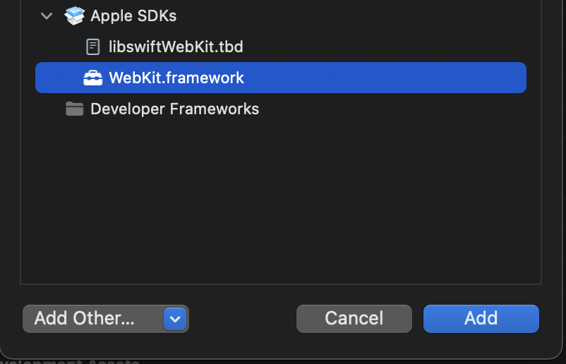Apple SDKs에 들어있는 WebKit.framwork를 아래와 같이 추가해주자.