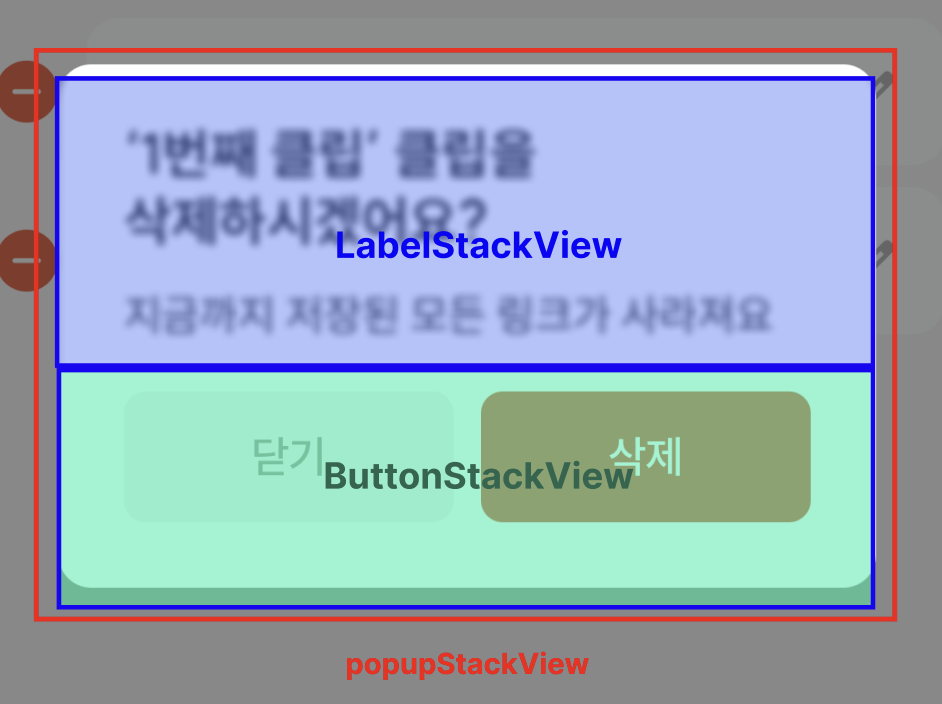 텍스트에서 받는 내용 (메인, 하위)과 버튼에 따른 타입(Confirmation, Cancelable)에 따른 크기를 조정하기 위해 레이아웃은 한 StackView 안에 2가지 StackView가 다시 들어가있는 형태로 구성했다.