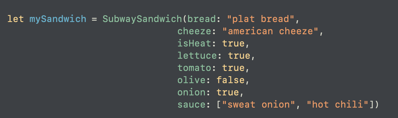 이 상황을 iOS 개발자의 입장에서 <서브웨이 샌드위치>를 객체로 바라보고 코드로 표현하면 아래와 같이 작성할 수 있겠다.