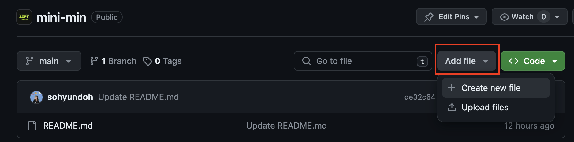 본인 레포 메인으로 들어가서, 첫 화면에서 Add file → Create new file을 눌러주자.
