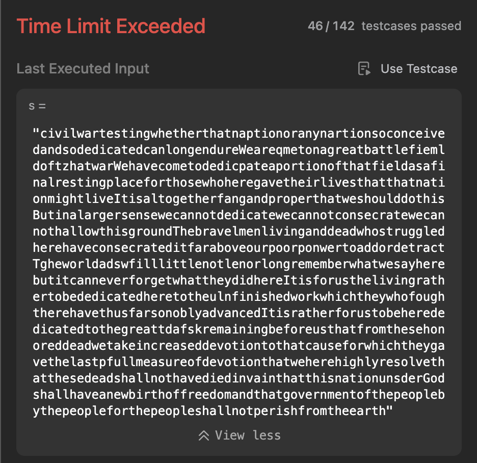 하지만, 해당 코드는 46번째 test case에 대해 Time Limit Exceeded 에러가 발생하며 통과하지 못했다.